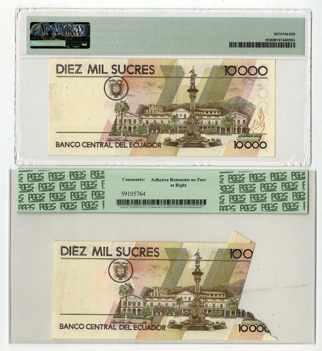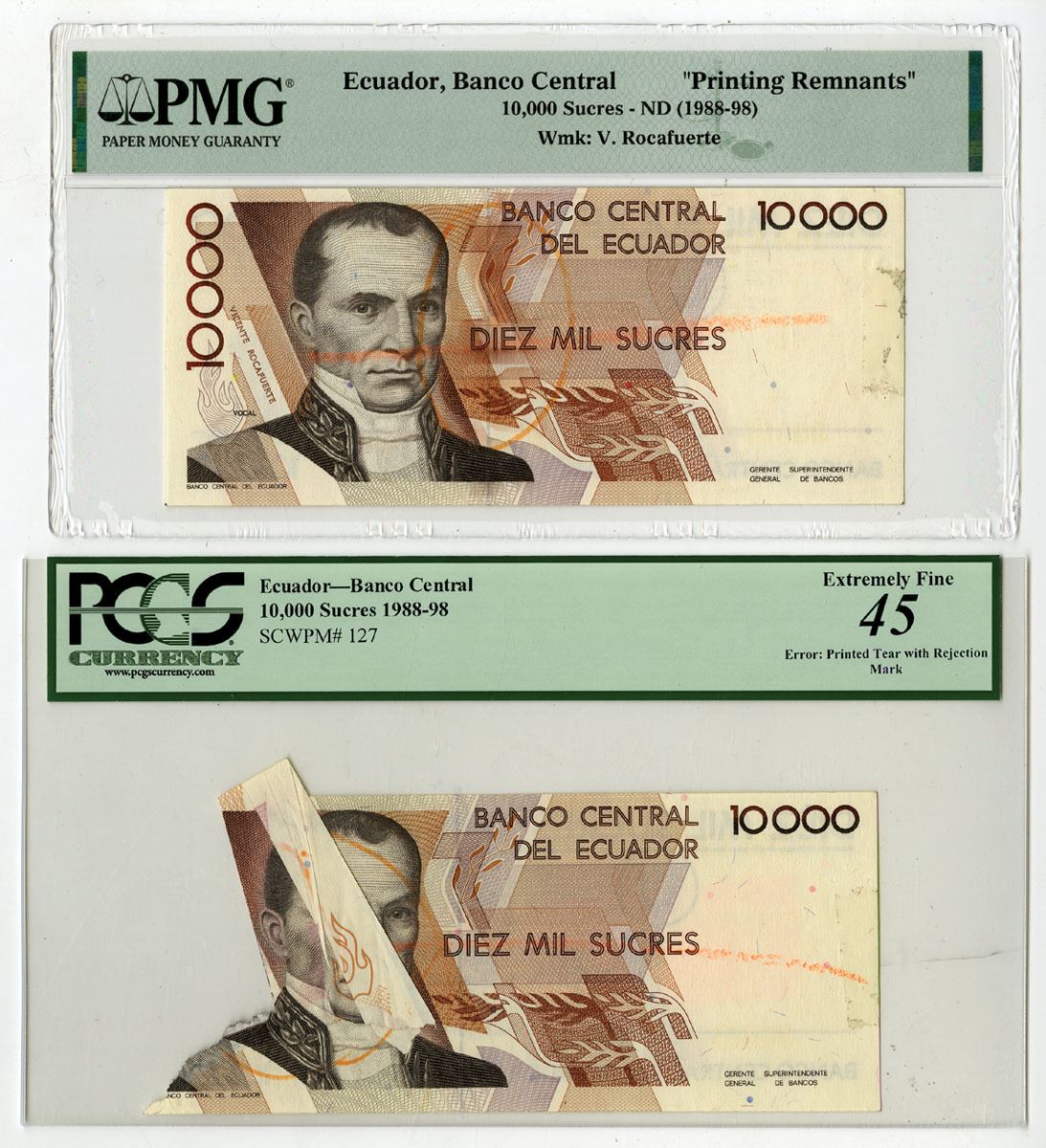 Ecuador, 1988-89. Lot of 2 Error Banknotes, Includes: 10,000 Sucres, P-127, Printing Remnant with Rejection Markings on face, IN PMG holder without grade; 10,000 Sucres, P-127, PCGS graded Extremely Fine 45 Error: Printed Tear with Rejection Mark and Comment "Adhesive Remnants on Face at Right. (2). Sold "AS IS" no returns accepted.