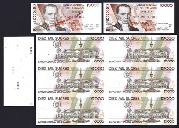 Ecuador, includes uncut sheet of 10000 Sucres, P-127, incomplete printing on obverse, AU; specimen dated 1988, P-127s1, series AB, UNC; issued note dated 14 December 1998, P-127, UNC; and miscut, incomplete P-127 dated 14 December 1998, with just signatures and serial numbers printed, UNC.