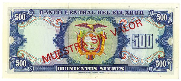 Ecuador. Lot includes a specimen 500 Sucres banknote, "MUESTRA SIN VALOR" overprint, TDLR. P-119s1. Choice Unc.