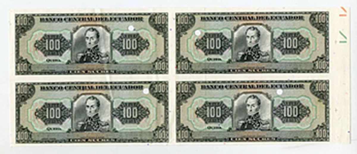 Ecuador, ND (1980s). 100 Sucres, P-123 for type, Uncut Block of 4 Specimen - Proofs, Dark gray green on m/c underprint with Bolivar at center, No serial #, signatures, series, date, POC in each, Choice AU condition. The 2 notes on the right have a security thread, the notes on the left do not have one. Rare in this format.