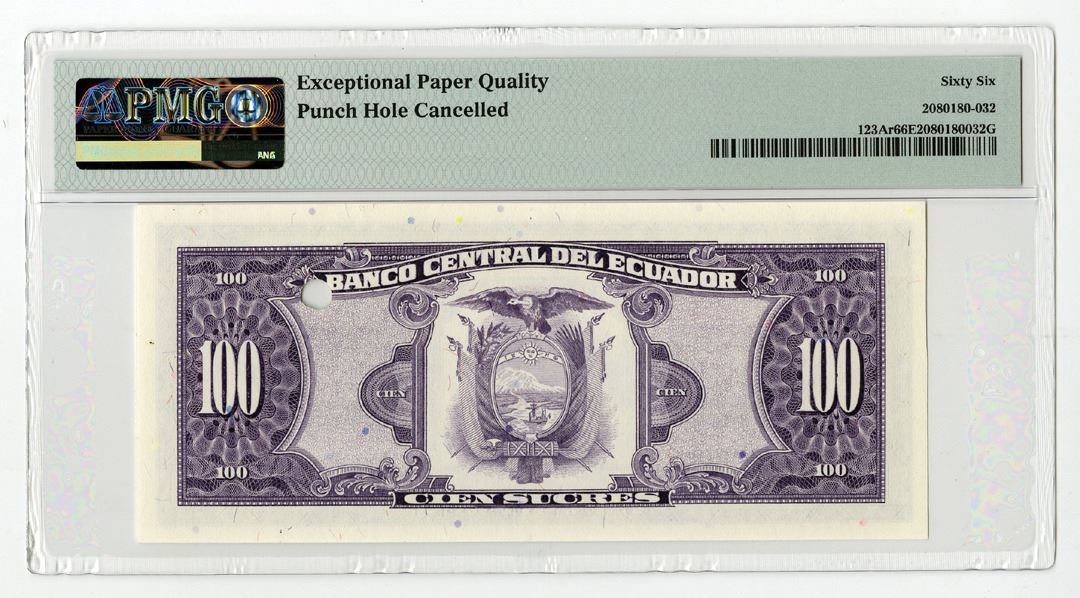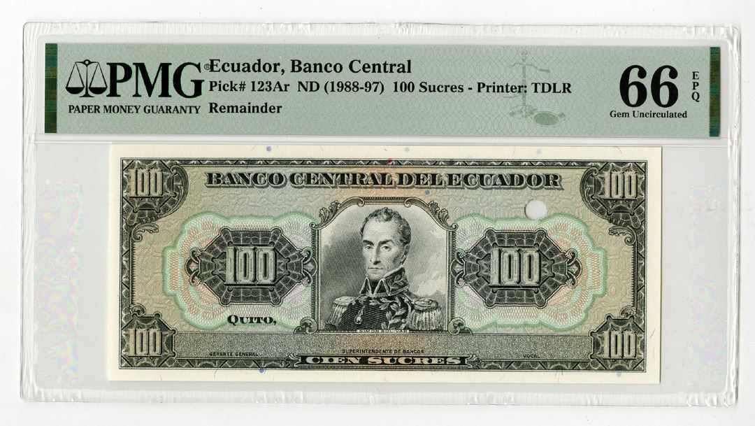 Ecuador, ND (1988-97). Banco Central del Ecuador 100 Sucres, P-123Ar, Graded as a Remainder Banknote but is really an unmarked Specimen directly from the ABN Archives with POC's. Black on m/c underprint with portrait of Simon Bolivar at center with dark clouds behind. Printer: TDLR without imprint. PMG graded Gem Uncirculated 66 EPQ with comment "punch hole cancelled."
