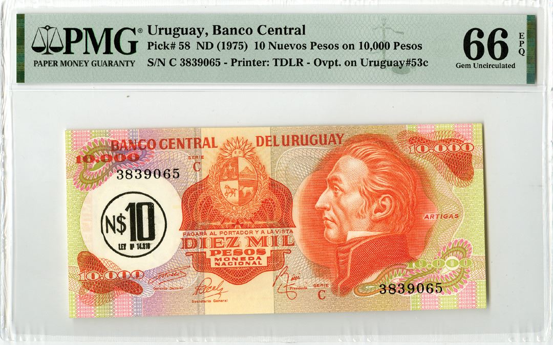 Uruguay, ND (1975). 10 Nuevo Pesos on 10,000 Pesos, P-58, Issued Banknote. Orange on m/c underprint with portrait of J. G. Artigas at right with overprint at left. S/N C 3839065 Printer: TDLR. PMG graded Gem Uncirculated 66 EPQ. Highest graded out of 2 graded in PMG census.