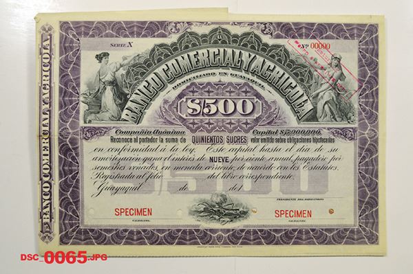 Guayaquil, Ecuador. $500 Specimen 9% Coupon Bond, Black print on purple border and under tint, Image of allegorical figures flanking ornate company title at top, Specimen overprints and POC's, VF-XF condition, ABNC.