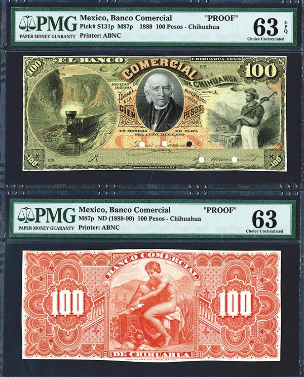 Chihuahua, Mexico. 100 Pesos, Ser. A, P-S131p M87p, uniface obverse and reverse proofs printed on india paper mounted on thin card that is cut down to banknote size. The face is Black on light orange, yellow and light green, train through mountains at left, miner at right and Hidalgo in middle, back orange, The face is PMG graded Choice Uncirculated 63 EPQ and the back Choice Uncirculated 63, Rare note in any condition and form. ABNC. Unlisted as a proof in SCWPM. Listed as a specimen for $2000. This is the only graded example listed in the PMG census.