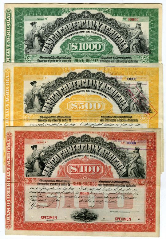 Guayaquil, Ecuador, ca. 1900s. Lot of 3 Specimen Coupon Bonds, including: 100 Sucres 8% in red; 500 Sucres 7% in yellow; and 1000 Sucres 8% in green. All have red specimen overprints, 00000 serial numbers, and POCs. Fine condition, ABNC. (3)