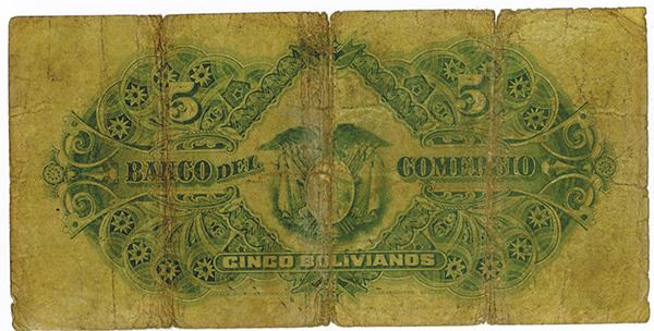 Bolivia, January 1st, 1900, 5 Bolivianos, P-S132, Issued, Black on light green, Allegorical woman with child and cornucopia at left, portrait at right, back green with arms at center, S/N A 005059, Choice VG to Fine with small edge faults, small nicks in middle top and bottom margins where there is a strong fold, Attractive and rare. BW&C.