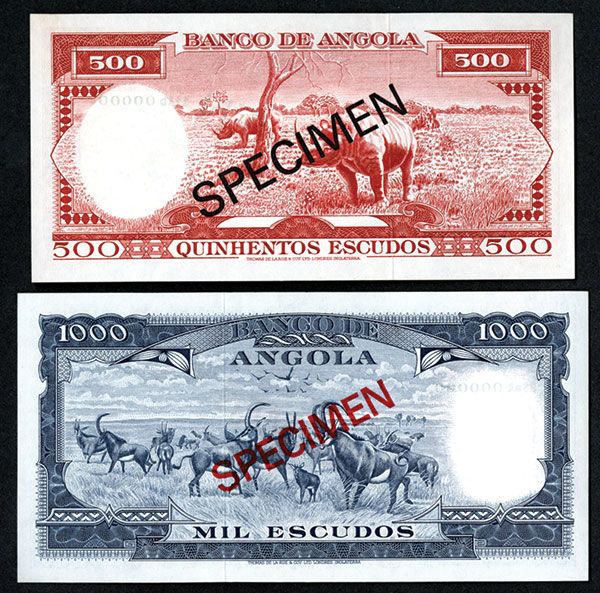 Angola, Lot of 2 notes, Includes 500 Escudos, P-97 and 1000 Escudos, P-98, both unlisted as specimens, Both with either black or red specimen overprints, "00000" serial numbers, both are Choice to Gem Uncirculated condition. TDLR. Attractive notes.