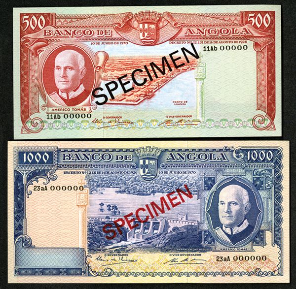Banco De Angola, 1970 Issue Specimen Pair. Angola, Lot of 2 notes, Includes 500 Escudos, P-97 and 1000 Escudos, P-98, both unlisted as specimens, Both with either black or red specimen overprints, "00000" serial numbers, both are Choice to Gem Uncirculated condition. TDLR. Attractive notes.