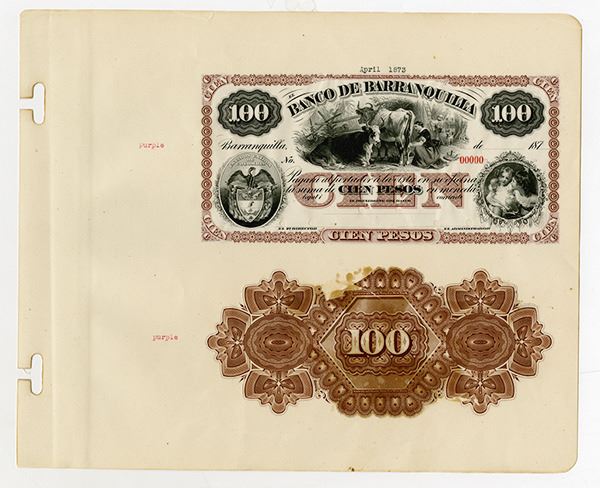 Barranquilla, Colombia, 187x (1873), 100 Pesos, P-S237 unlisted Proof banknote, Black on brown border and underprint, Milkmaid milking cows, Colombia arms lower right, Children lower right, Proof printed on india paper mounted on album page with the face on top and the back below it, The face is uncirculated, the back has paper flaking off and tears, still rare, ABNC.