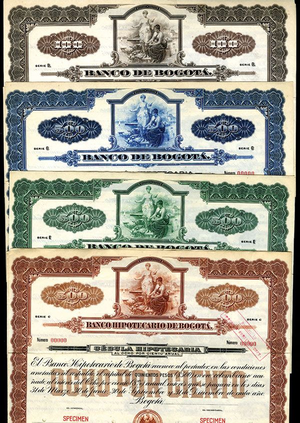 Lot of 4 Colombian Specimen Bonds. 1)100 Pesos Series D Specimen Bond. Black print with violet border and underprint. Allegorical women at wharf with factories in distance top center. VF condition. ABNC. 2)500 Pesos Series C Specimen Bond. Black print with dark red border and underprint. Allegorical women at wharf with factories in distance top center. VF condition. ABNC. 3)500 Pesos Series E Specimen Bond. Black print with green border and underprint. Allegorical women at wharf with factories in distance top center. VF condition. ABNC. 4)500 Pesos Series C Specimen Bond. Black print with blue border and underprint. Allegorical women at wharf with factories in distance top center. VF condition. ABNC.