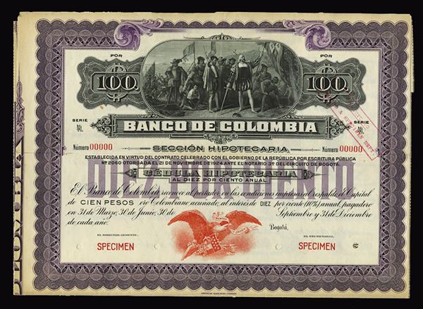 Bogota, Colombia, 1924, 100 Pesos Oro, Series N, 10% Bond, Unlisted but Similar to P-S397 with portrait of "Landing of Columbus" on top but different denomination, Specimen banknote/circulating bond, Black title, vignette and text with Dark brown border and red eagle on bottom, Unlisted denomination and color in Pick. Red specimen overprint, POC's and "00000" serial numbers. Coupons attached. Impressive vignette of "Landing of Columbus" measuring 4 5/8ths by 2 1/8th inches. AU condition with horizontal fold in middle as made. Rare note. ABNC.