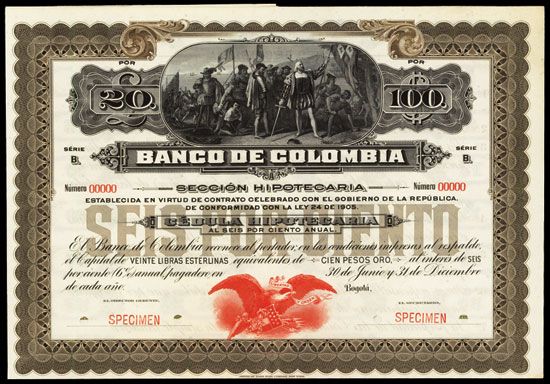 Bogota, Colombia, L.1905 (ca.1919), 20 Pounds - 100 Pesos, P-S397 Unlisted Specimen banknote. Brown border, Series B. Unlisted denomination and color in Pick. Red specimen overprint, POC and Ò00000Ó serial numbers. Coupons attached. Pays 6% interest, Impressive vignette of ÒLanding of ColumbusÓ measuring 4 5/8ths by 2 1/8th inches and red eagle on bottom. AU to Uncirculated condition. Rare note. Similar to a Bono De Caja or Interest Bearing Treasury Note. ABNC.