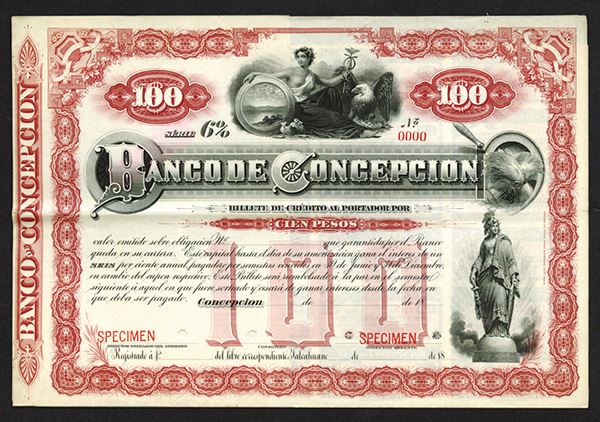 Concepcion, Chile, 18xx. (ca.1880-1890), 100 Pesos, Series 6%, Red border and underprint with topless allegorical woman on top with eagle, Allegorical standing Liberty on bottom right and sheaves of wheat on the right of the title, coupons attached, Specimen overprints, POC's, VF, rare Chilean bond. ABNC.