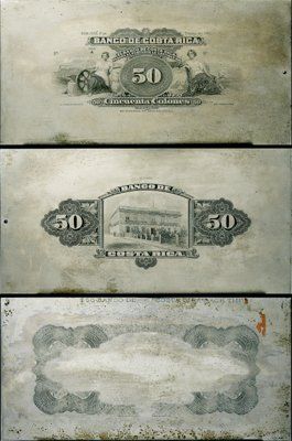 San Jose. Costa Rica. Jan.1, 1901. P-S176 Unlisted. 50 Colones, Serie A. Face and back printing plates of this rare issue. Missing the border plate of the face but includes the vignette, title and text plate of the face and the vignette, title and text plate of the back and also the border back plate. Vignette of young woman in center on face. 9 by 4.5 inches. Plate # C-7071 on top of face plate and C-623 on top of back plate. Plates are in XF condition with light hairlines from past plate cleaning but no other detracting marks. Extremely rare Costa Rica Numismatic item. Unique in archive. ABNC