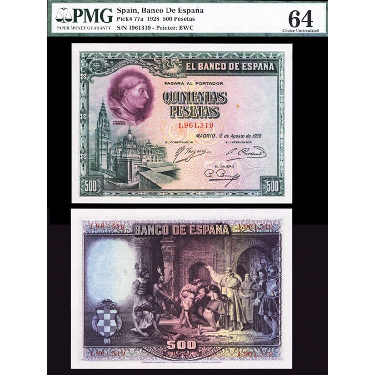 Spain, 1928, 500 Pesetas, P-77a, Issued, Green and purple, Cathedral of Toledo at lower left, PMG graded Choice Uncirculated 64, very attractive and high grade for the issue, BWC.