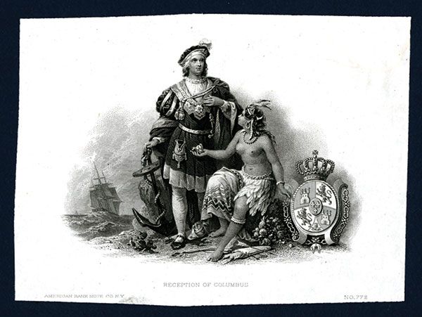 Spain, 1876, from the 1876 Issue, Banco De Espana, P-13; 1000 Pesetas. The 1000 Pesetas vignette is described as "Spaniard with Indian Maiden", but it is in reality the titled vignette "Reception of Columbus". cut down LDP's on india paper. Rare Spanish vignette from extremely rare note. Choice Uncirculated condition. ABNC