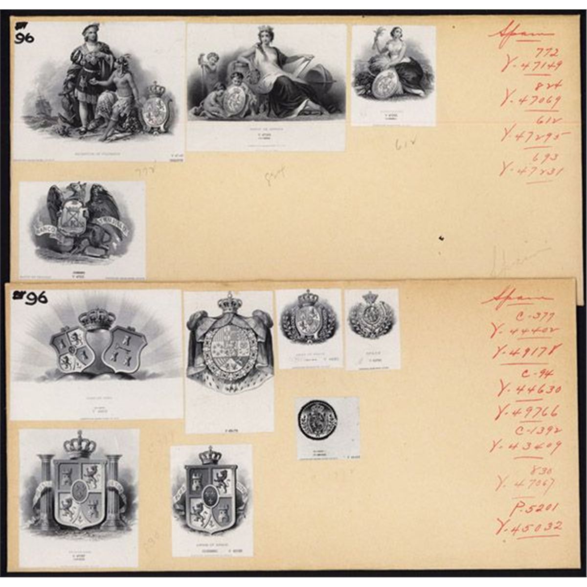 Lot of 11 proof vignettes mounted on large envelopes, Spain, 1876. P-11; 12; 13 Unlisted. 3 different proof vignettes printed on india paper mounted on large manila envelope with archival notations. Extremely rare face proof vignettes from the 1876 Issue, Banco De Espana, P-11, P-12 and 13; 100, 500 and 1000 Pesetas. The 1000 Pesetas vignette is described as “Spaniard with Indian Maiden”, but it is in reality the titled vignette “Reception of Columbus”. Both are cut down LDP's on india paper. Also includes “Banco De Trujillo” from Peru. In addition to these vignettes, there are 7 different Arms of Spain proofs. Rare Spanish vignette group. Choice condition. ABNC