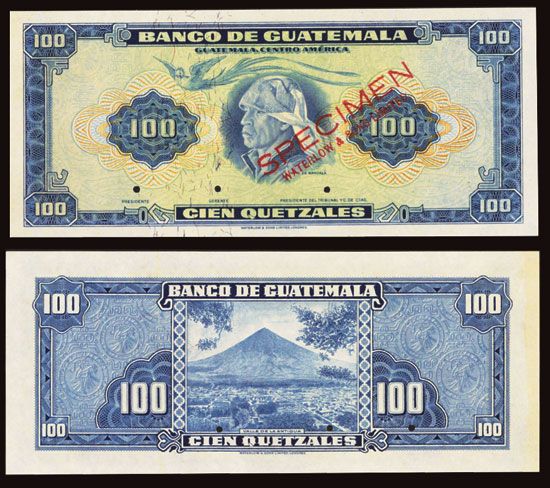 Guatemala, ND (ca.1955-58), 100 Quetzales, P-34s, Unlisted Specimen banknote, dark blue on lime green, Nahuala in center, Red Specimen - WATERLOW & SONS LIMITED overprint, small POC's, PMG graded Choice Uncirculated 63, excellent centering, sharp corners, large even margins and bright colors only enhance this lovely note that has claims to a higher grade designation. W&S.