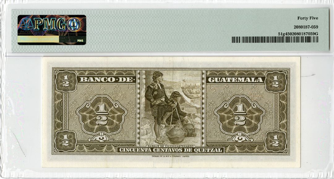 Guatemala, 1970. 1/2 Quetzal, P-51g, Issued Banknote. Brown on m/c underprint with hermitage of Cerro del Carmen at left. S/N Q5232243 Printer: TDLR. PMG graded Choice Extremely Fine 45.
