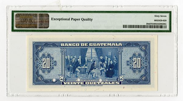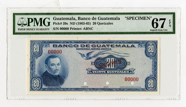 Guatemala, 20 Quetzals, P-39s (Unlisted specimen), blue on m/c, portrait of Landiivar at left, Specimen overprints, POC's and Zero serial numbers. PMG graded Superb Gem Unc. 67 EPQ, Attractive note. ABNC. The highest grade and finest known out of 6 graded in the PMG census and the only one to be offered at auction in this graded. Rare note that will be impossible to improve upon.