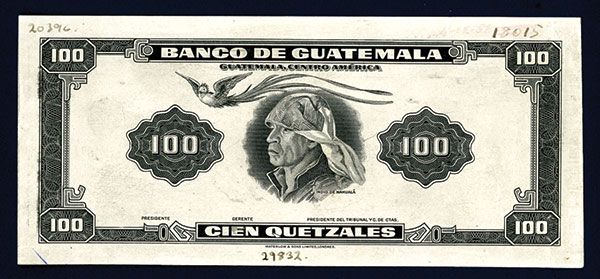 Guatemala, black and white obverse proof of the 100 Quetzales, P-34. W&S. AU with printer markings on to margin and tear near top left. W&S.