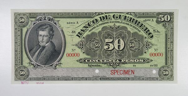 Iguala, Mexico. Banco De Guerrero, 190x (1904 printed on back) Specimen 50 Pesos Ser.A, P-S301s1, CH. AU-Uncirculated with one light corner fold keeping this well centered note from CU condition, Specimen overprints, POC's, S/N 00000, "Nov 1904" hand stamped on bottom left face margin and "June 23, 1904" on the top left back margin. This is the rare Series A variety, not the Series B that was cancelled. ABNC