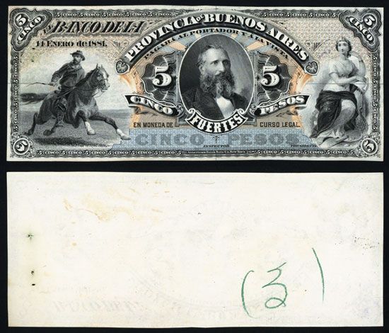 Argentina, 1881, 5 Pesos Fuertes, P-S-529 Not Issued Banknote, Uniface Specimen or Proof, Gaucho on horseback on left, Seated woman on right, Dr.A Alsina at center, 3 pin holes on the left that is difficult to see otherwise the note appears Uncirculated to CU condition. ABNC. Unpriced in SCWPM and only known as specimen, but this might be a proof.
