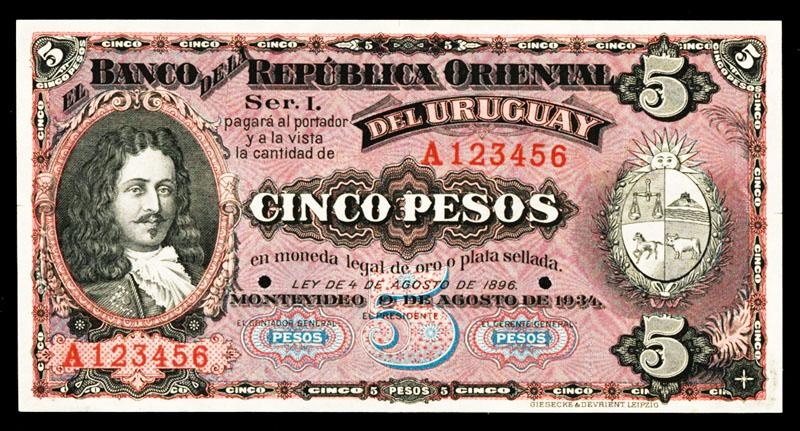 Banco De La Republica Oriental Del Uruguay, 1934 Specimen Banknote.Montevideo, Uruguay, 1934, 5 Pesos, Ser. I. P-22 Unlisted Specimen, Black on pink and lilac underprint, man with long hair on left with arms on right, S/N A123456, POC, Uncirculated to CU condition. G&D. Attractive banknote.
