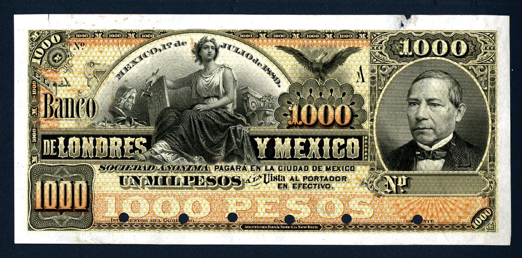 Mexico. 1889, 1000 Pesos, Ser. A. P-S239 Unlisted proof face printed on india paper that is unmounted. AU condition with small tears on top left and right margins. ABNC. Rare as proof.