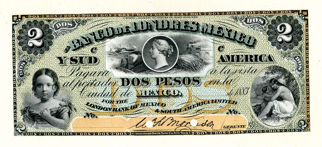 Mexico. 1883. 2 Pesos, P-S220 Unlisted proof face printed on india paper on large card. Choice uncirculated condition. ABNC. Extremely rare and attractive note.