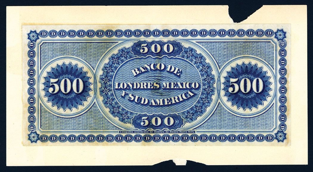 Mexico. 18-- (ca.1866). 500 Pesos. No Series. P-S223Ap2 Unlisted. Back proof printed on india paper on large card. AU condition with light foxing and the card missing a small piece on the top right margin away from the india paper. ABNC. Extremely rare note.
