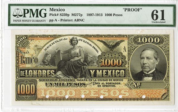 Mexico, 1889, 1000 Pesos, Ser. A, P-S239p, Proof printed on india paper only, no back proof, black on orange and light yellow underprint, Allegorical woman at left Juarez at right, Listed in SCWPM as date 189x, this has a fully printed date of 1889, PMG graded Uncirculated 61 with note of previously mounted and small tear on the excess upper right margin. Rare and desirable note missing from most collections. ABNC.