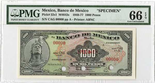 Mexico, 1000 Pesos, Ser. CAG, P-52s1 M4643s, Specimen, Cuauhtemoc at left, back purple with Pyramid, Specimen overprints, POC's, PMG graded Gem Uncirculated 66 EPQ. ABNC