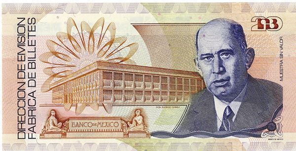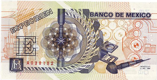 Mexico, No denomination, Specimen ad note, engravers instruments on back, ornate design and portrait of Don Rodrigo Gomez on right with building on left. Uncirculated to Gem Unc.