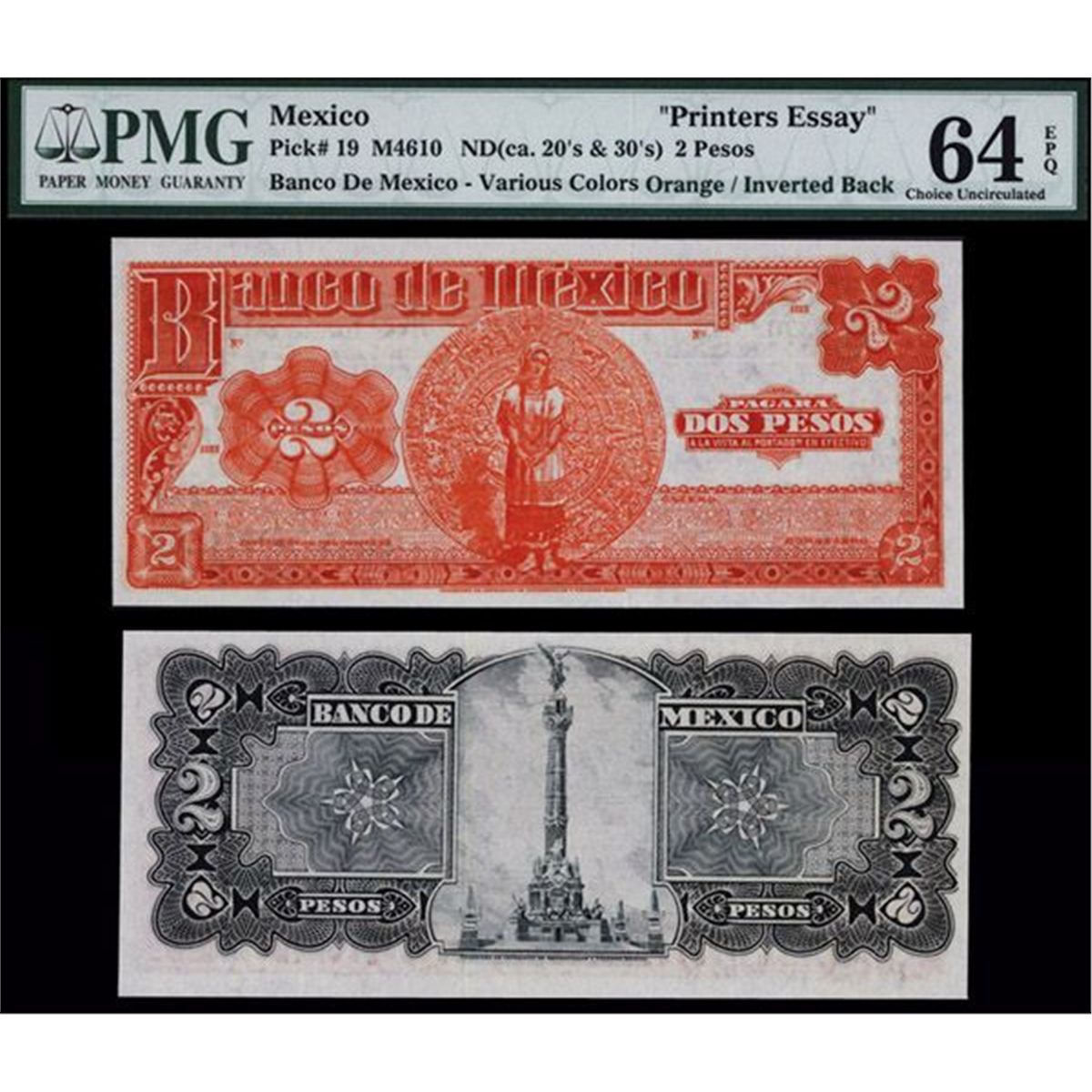 Mexico, ND (ca.1920-30's), 2 Pesos, P-19 (M4610), “Printer Essay”, Red with Aztec Calendar stone with young woman in middle, back black with monument but inverted in relation to the face, PMG graded Choice Uncirculated 64 EPQ (Exceptional Paper Quality) . Rare Mexican essay of unreleased denomination. Mexican printer.