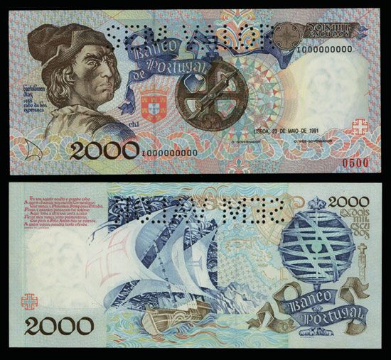 Lisboa, Portugal, May 23, 1991, 2000 Escudos, P-186as, Unlisted Specimen, Brown on blue and m/c, Bartolomeu Dias on left, Arms in middle with sextant or surveyors instrument, S/N 1000000000 - 0500, Pin punch SEM VALOR, PMG graded Choice Uncirculated 64 EPQ, Rare note as specimen.