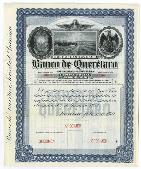 Queretaro, Mexico. Banco De Queretaro, Odd Pesos Specimen bond. Blue border and undertint. Arms of Mexico on right, Arms of Queretaro on left and train under viaduct in middle. XF condition. ABNC. Scarce bond.