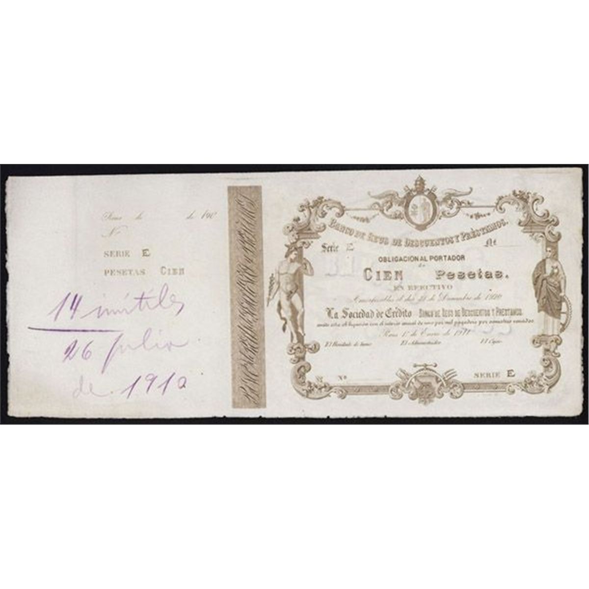 Reus, Spain, 1st January, 1911, 100 Pesetas, Serie E, Specimen banknote, brown with no underprint printed on white watermarked paper with Banks title, Arms on top with Standing allegorical Mercury on left and woman on right, counterfoil on left, AU to Uncirculated condition, Unlisted bank in SCWPM. A. Roca imprint on bottom, Crayon archival notation on left counterfoil area with 1910 date. Very attractive and first time seen by cataloger.