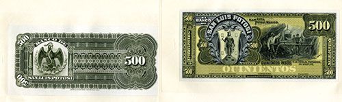 San Luis Potosi, Mexico, ND (ca.1897-1913). No Series. 500 Pesos, P-S404p Unlisted variety, Full color Face and back proofs on large off white cards. Printed on india paper on card. Choice to Gem Uncirculated condition. Rare note. ABNC.