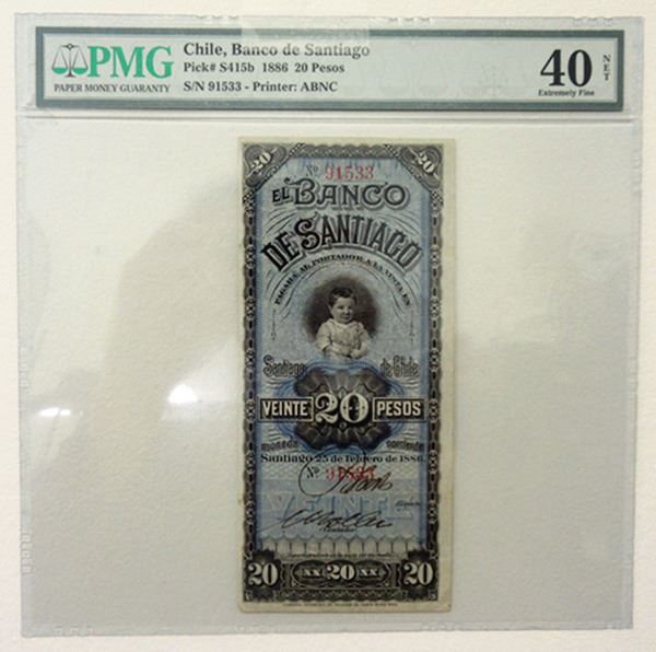 Santiago, Chile, 25th February, 1886, 20 Pesos, P-S415b, Issued obsolete banknote, Black on blue underprint on face with young child in middle under title on vertical format notes; back blue but printed in horizontal format, S/N 91533, PMG graded Extremely Fine 40 NET with note of small corner tip missing, Amazing note and first time seen as an issued note by the cataloger, ABNC. This is the only example and also highest issued and graded one in the PMG census.