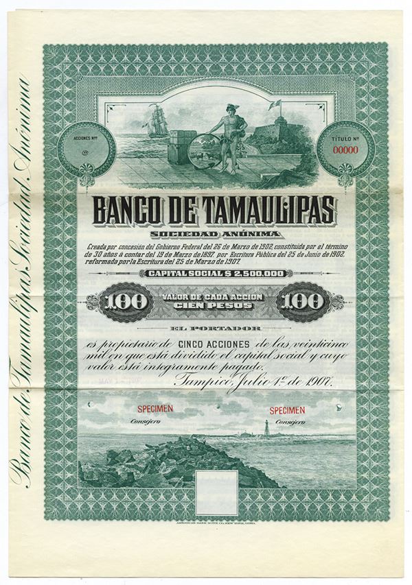 Mexico, 1907, 100 Pesos=5 Shares, Specimen Bond, Green border with allegorical Mercury on top at sea shore and bottom with ocean, breakwater and shore view , Coupons attached, POC's, XF, ABNC.