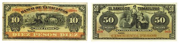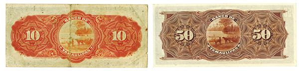 Tampico, Mexico, Lot of 2 notes, Includes 10 Pesos, P-S430c, VF, and 50 Pesos, Series H (Unlisted Series in SCWPM), P-S432d, Uncirculated to CU condition, ABNC. Attractive pair of notes. ABNC.