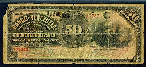 Caracas, Venezuela. Hand Stamped Date 1935 or 1936, 50 Bolivares, P-S312, Issued banknote, Black on m/c underprint, back orange, Seated allegorical “Arts” at right with bank title at left, two signature titles, S/N 177573, PMG graded Good 6 NET with notation of missing corner. Rare note in any condition and this is still a very collectible example that will be difficult to improve upon. ABNC.
