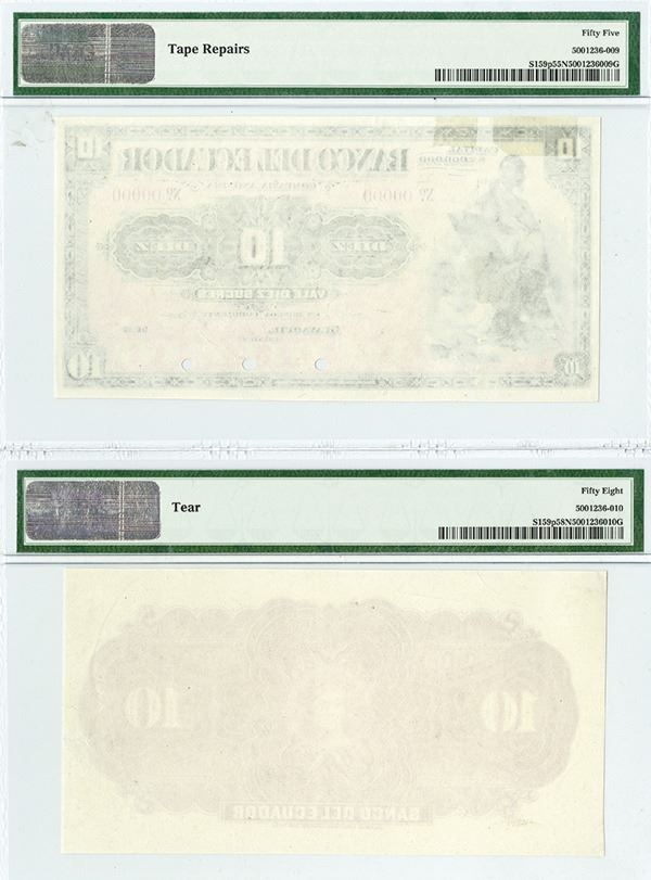 Ecuador, 10 Sucres, P-S159p, Uniface face and back proofs, the face is PMG graded About Uncirculated 55 NET with note of tape repairs and the back is graded Choice About Unc. 58 NET with note of small tear, ABNC.