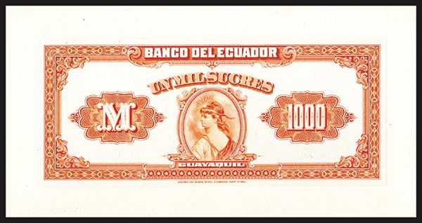Guayaquil, Ecuador, 1000 Sucres, P-S164p, Proof Back printed on india paper on large card, Gem to Superb Gem Uncirculated, only known as a specimen or proof, none known issued, extremely rare note and rarely seen at auction. ABNC.