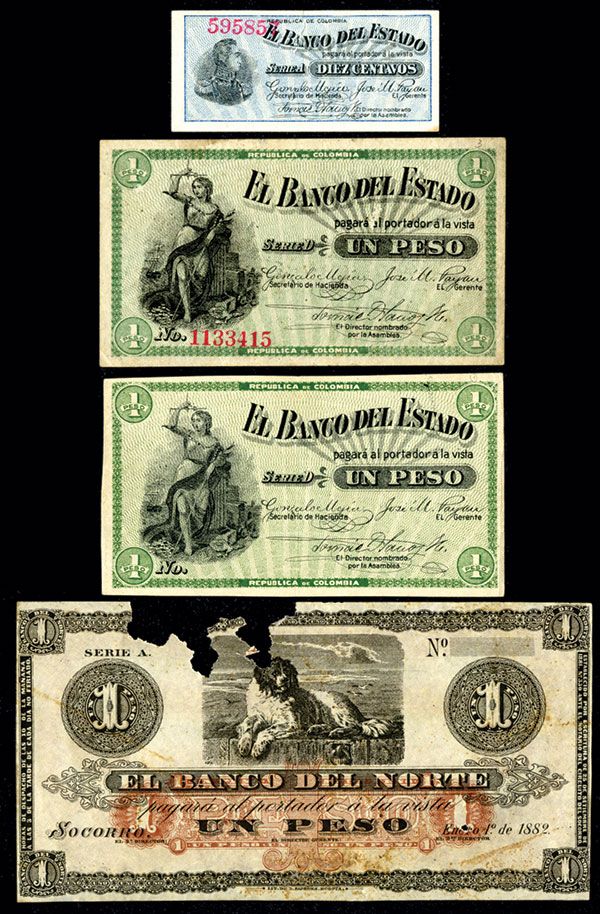 Colombia, Lot of 4 notes, Includes 1900 Issues, 10 Centavos, AU-Unc. And 2 examples of 1 Peso, in XF to AU; also included is a damaged Banco Del Norte, 1882, 1 Peso, P-S681, VF with pieces missing on top left.