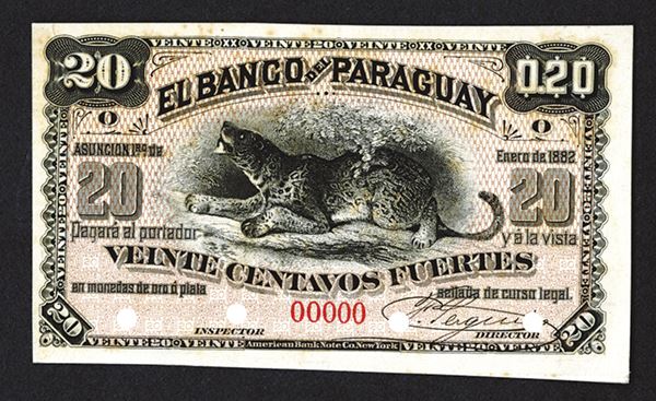 Asuncion, Paraguay, 1882, 20 cents, Ser.O, P-S123p, Uniface front proof with leopard in middle, black on light brown underprint, S/N 00000, Printed on india on thin cardboard, Uncirculated to Choice Uncirculated with light toning spots on top left, Attractive note. ABNC.