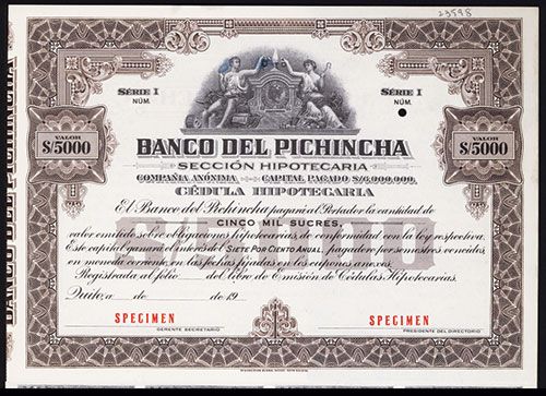 Ecuador, 19xx, 5000 Sucres, 7% Specimen Bond, VF-XF condition, HBNC.