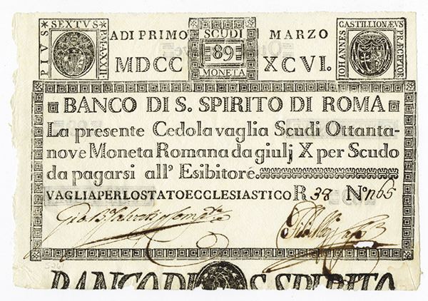 Italian States, 1786, 89 Scudi, P-S463, Issued banknote, Uncirculated but there are a couple of small areas of ink burn on the signature on the lower right, still a very attractive note rarely seen in this grade or in any form. The note catalogs for $750 in XF and is unpriced in Uncirculated condition.