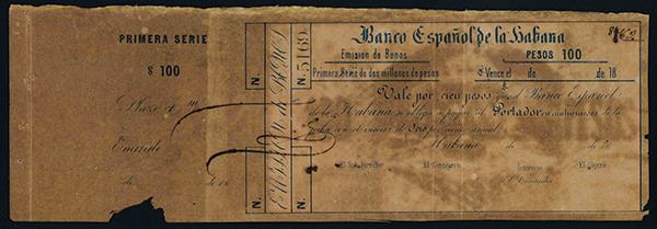 Havana, Cuba, 18xx (ca.1850-60's), 100 Pesos, 1st Series, 6% interest payable annually, P-Unlisted, Blue on brownish paper, Ornate title, no vignette, back blank, 2 ink markings between the counterfoil and the banknote, possibly as a counterfeit protector to match up the 2 sections at a later date, simple design, S/N 5169, Fine condition with toned brown paper with small nicks out of the right margin, a small 1 by 1/2 inch piece missing from the left counterfoil away from banknote design and a reinforced paper split on the counterfoil, also away from the banknote design. There is also an ink graffiti marking on the top right corner. Rare if not unique banknote.